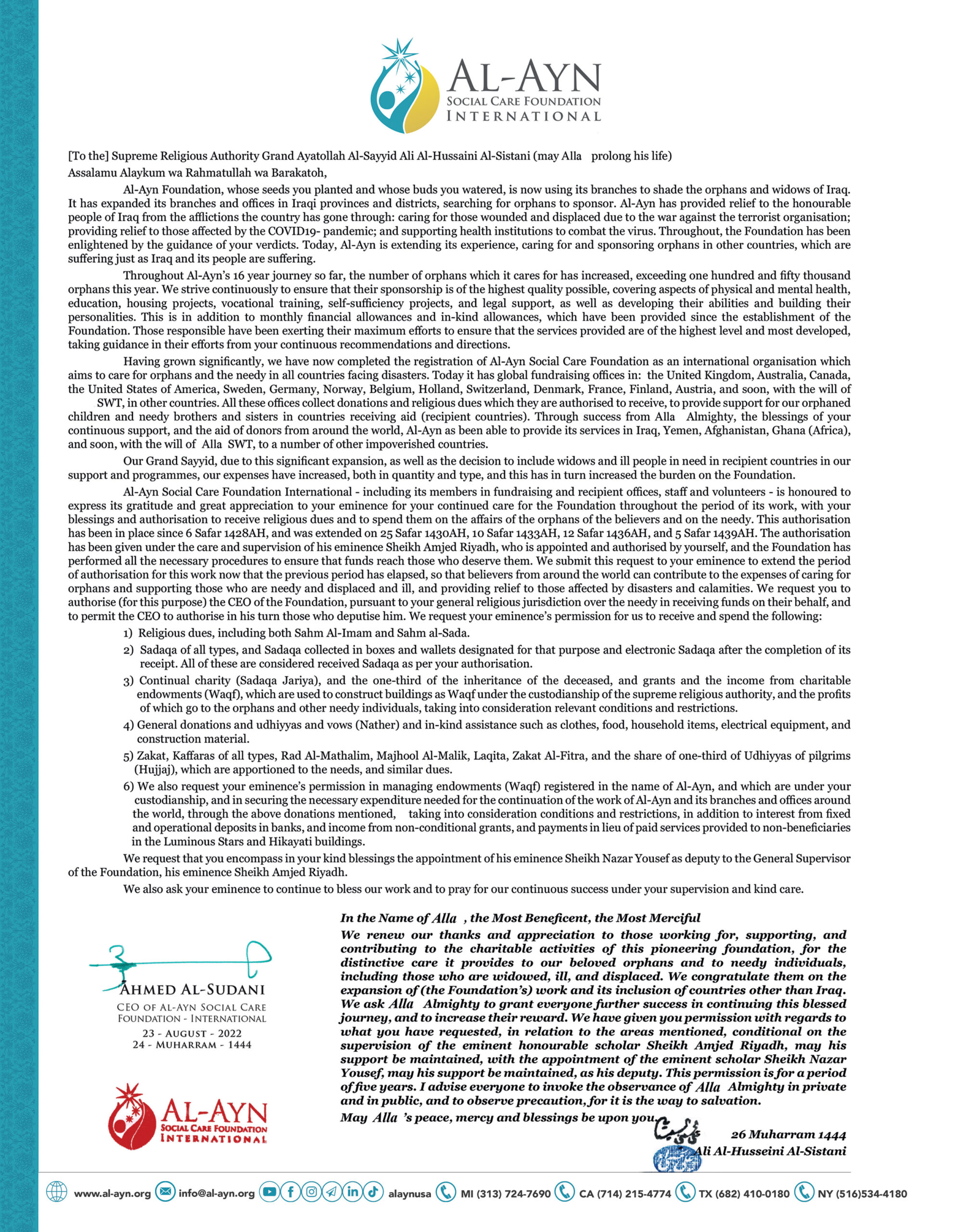 Al-Ayn vient en aide aux enfants orphelins depuis deux décennies avec le soutien direct et la bénédiction de Son Éminence Al-Sayyid Al-Sistani. Son autorisation nous permet de recevoir des dons religieux et caritatifs, une confiance que nous nous engageons à honorer. Consultez la dernière autorisation (Ijaza) de Son Éminence.