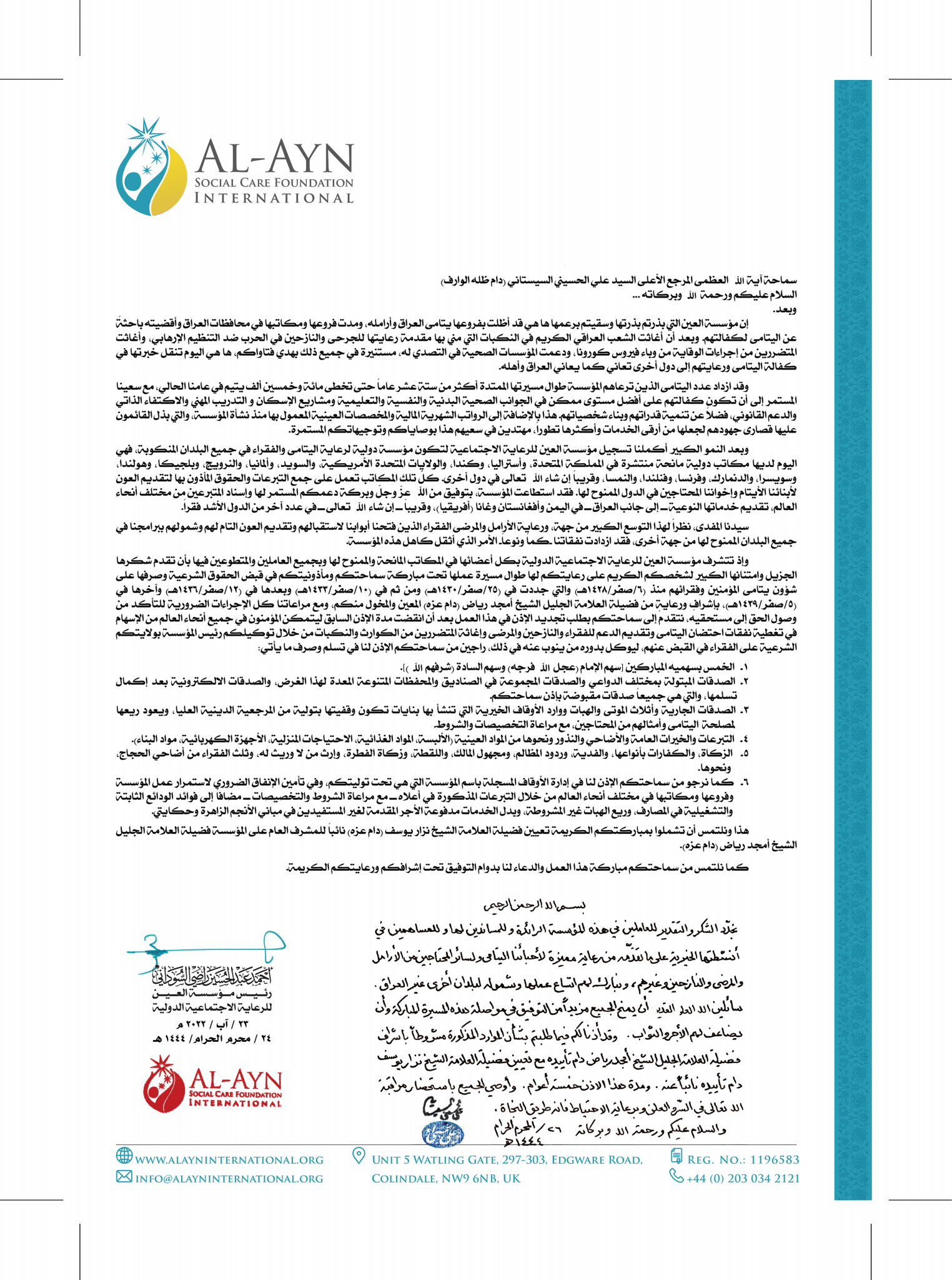 وتضمن هذه المأذونية أداء واجباتكم الشرعية بكل طمأنينة، مع تخصيص التبرعات لدعم الأطفال اليتامى بكل شفافية ومسؤولية. كما تُعد الإيصالات الصادرة عن مؤسسة العين كافية شرعاً لإبراء الذمة.